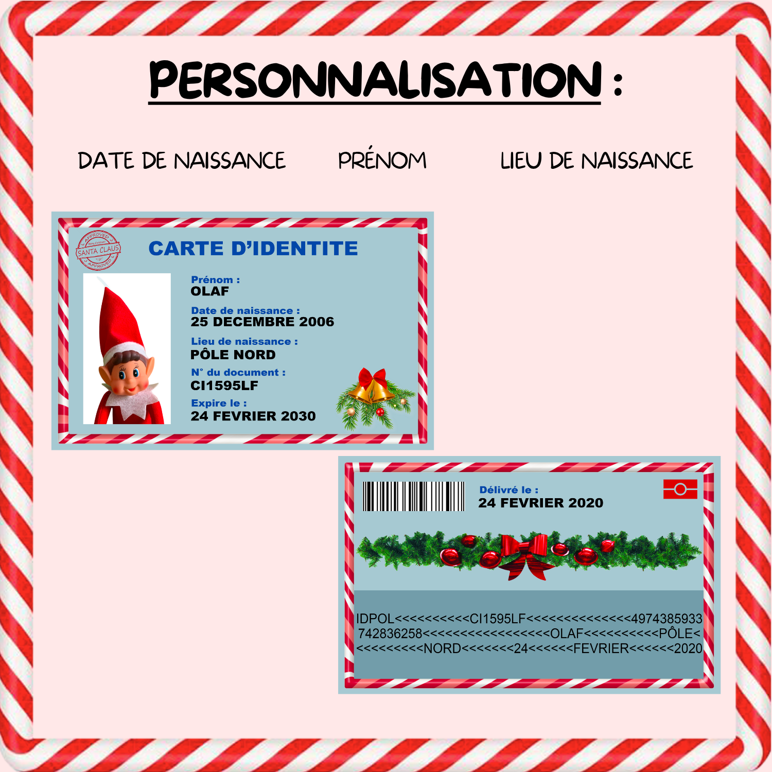 Entièrement personnalisée avec le prénom, la date et le lieu de naissance, cette carte est plastifiée pour durer tout le mois de décembre.